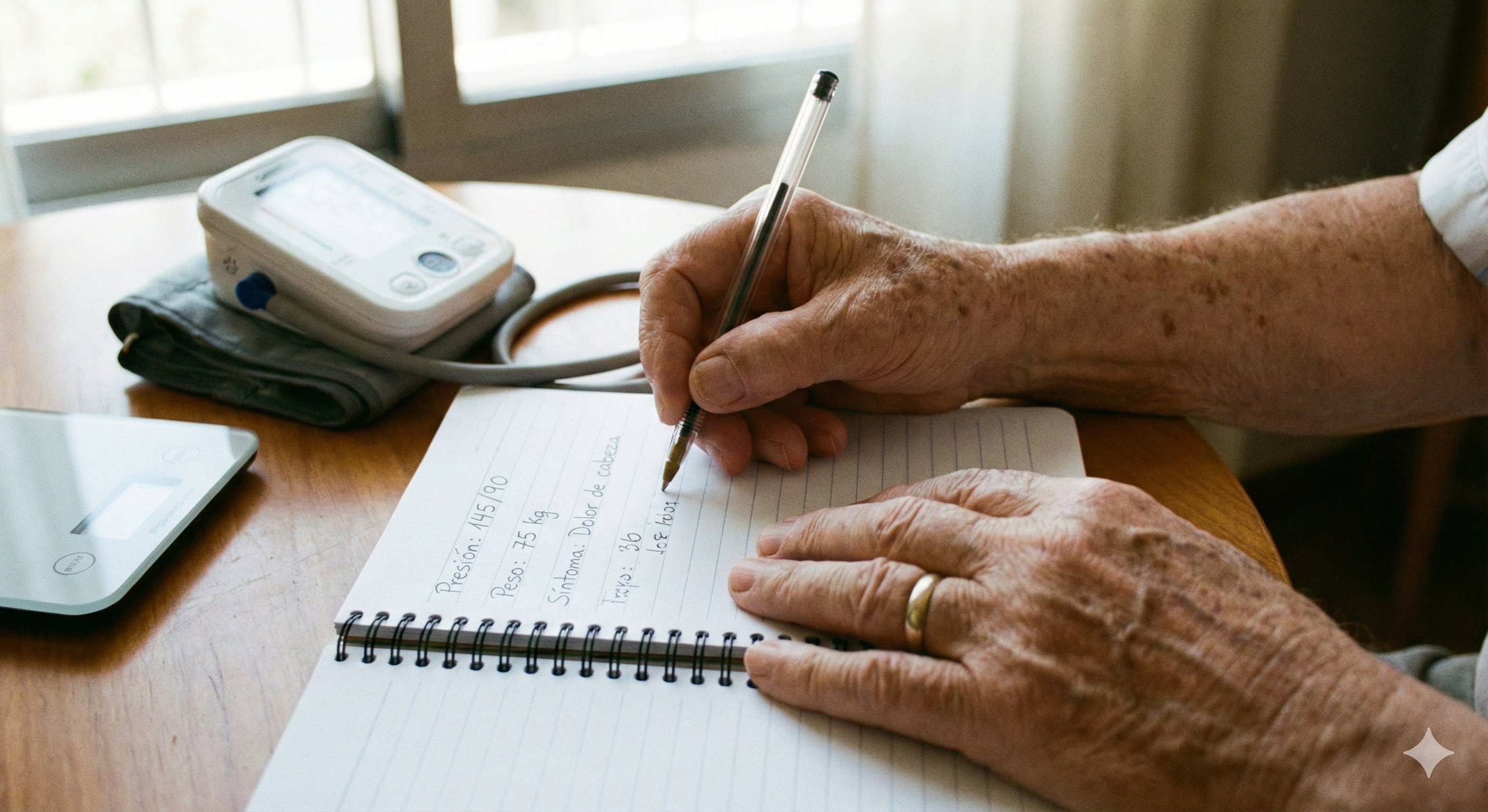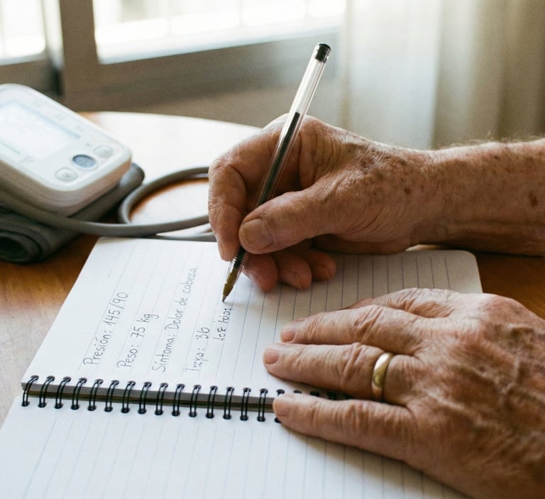 Chequeo rápido: ¿cómo te sientes hoy? (mareo, falta de aire, dolor nuevo, fiebre). Si tu médico lo pidió: presión/pulso y/o peso anótalo.