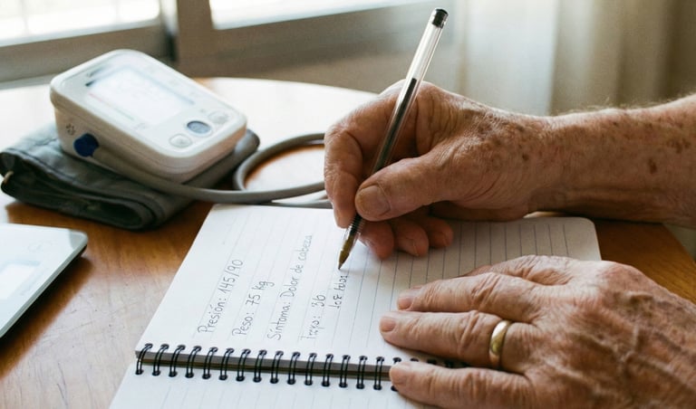 Chequeo rápido: ¿cómo te sientes hoy? (mareo, falta de aire, dolor nuevo, fiebre). Si tu médico lo pidió: presión/pulso y/o peso anótalo.