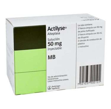 Alteplasa, medicamento trombolítico utilizado bajo criterios clínicos definidos y supervisión médica especializada.